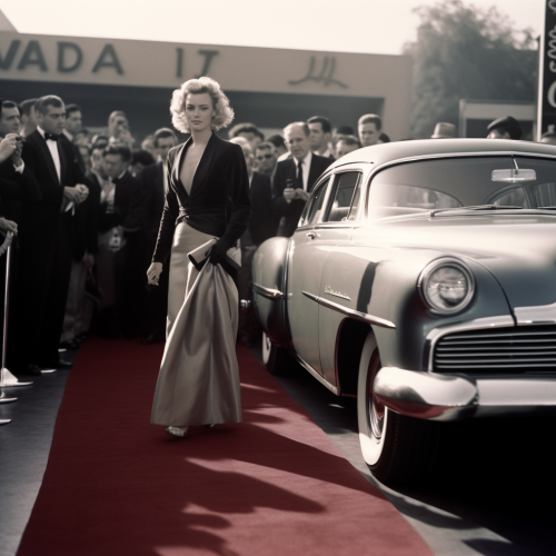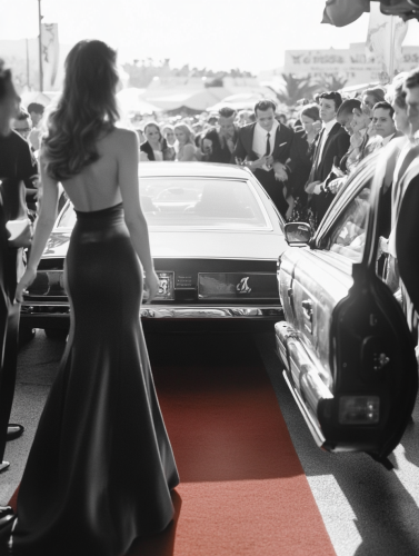 low angle shot, female 20 year old hollywood star exiting car, red carpet ceremony, entrance with car, chauffeur opening door to car, real photography, --v 5.0