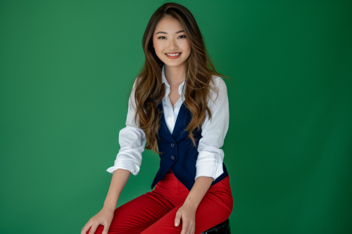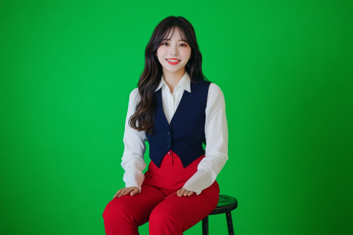 A beautiful Japanese female in her early twenties, wearing a white blouse, navy blue vest, and red trousers, sitting on an iron stool, facing the camera head-on with both feet visible. She has a bright smile, long hair with slight waves, and a friendly expression, on a solid green screen background. Full-body shot using Canon EOS R5 cameras, hd quality, natural look --ar 128:85 --v 6.1