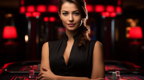 An elegant and confident female Thai blackjack croupier standing at a sophisticated blackjack table. She is dressed in a tailored, form-fitting black pantsuit with a stylish white blouse, exuding both professionalism and a touch of glamour. Her outfit is complemented by a sleek black bow tie, adding a classic and refined touch. red lights around --ar 16:9 --v 5.2 --s 250