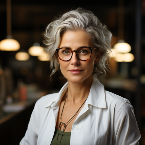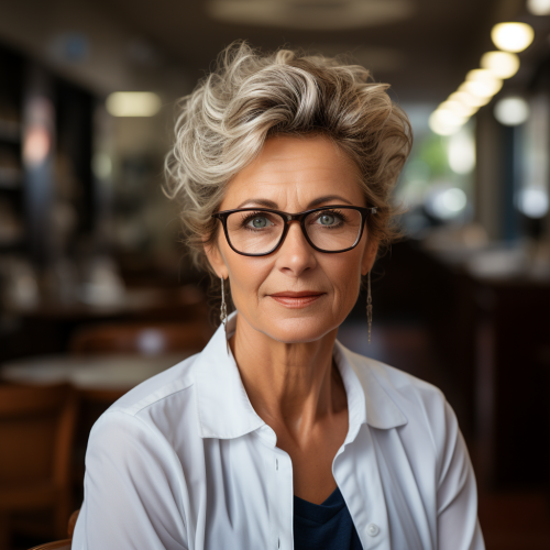 image d'un médecin féminin avec une blouse blanche de 50 ans, cheveux court avec des lunettes, réel, sérieux --s 750