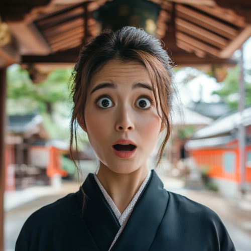 A woman who is late for a wedding is looking at the camera with a very surprised face. She is in front of a Japanese shrine or temple. She is wearing a traditional Japanese black long-sleeved kimono and is very beautiful. Her eyes are very pure and lovely. It is a very real human expression.