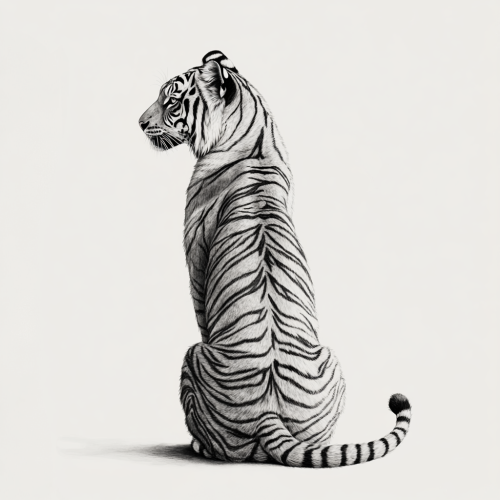 a calm and confident female tiger with a scorpion tail, looking towards the distance, full body, light pencil drawing , white background, black and white
