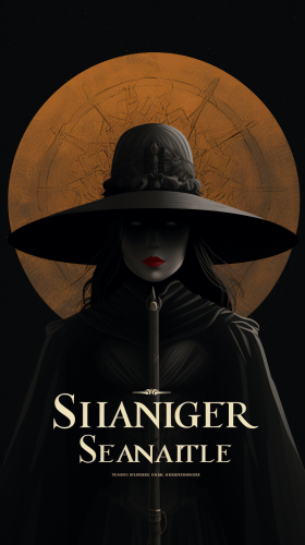1970's dark fantasy book cover paper art dungeons and dragons style drawing of spanish witch hunter dressed in black wearing black bolero hat and wielding long sword. southern spain with minimalist far perspective --ar 9:16