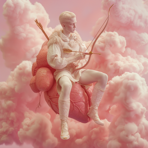 a feminine albino man in a white clothing, sits on a knitted human heart organ. He has drawn a golden bow and arrow. They fly through pink clouds. ultra detaileds, hyperrealistic --v 6.0