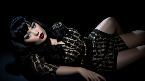 betty page, feminine pose, midriff, professional photo shoot, black background, illustration, photorealism, 35mm view --ar 16:9 --v 5.0