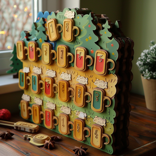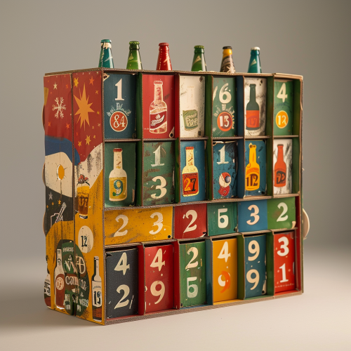 make a colourful 3D advent calendar with 24 closed doors with numbers and chrismas prints on it. The calender should have a beer theme and should be made of cardboard and be a bit children-like.