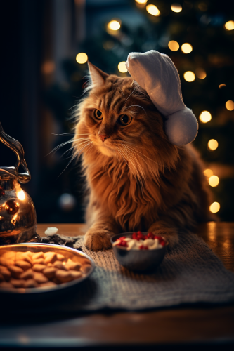 cat eating Sweet potatoes, christmas, realistic, captured by Canon EOS R camera, --aspect 6:9