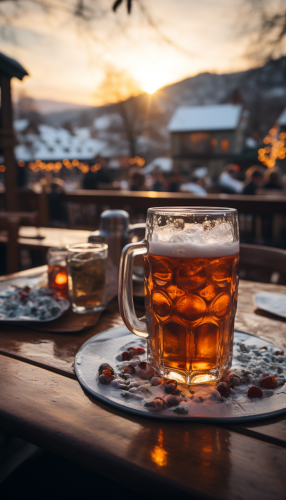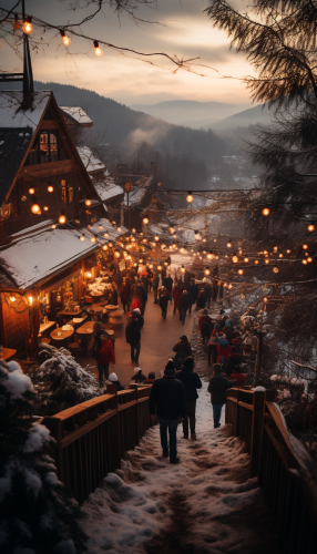 Outdoor Christmas festival. Extreme close-up. Asheville North Carolina. Snow. Beer. Holiday decorations. Beautiful scenery. Mountains. Sunset. Cold weather. --ar 4:7 --q 0.5 --s 750