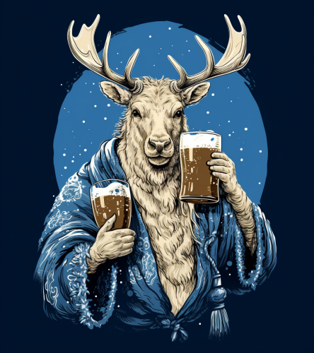 elk holding a beer mug, in the style of screen printing, dark azure and white, xmaspunk, tivadar csontváry kosztka, group f/64, monsù desiderio, parodic --ar 77:87 --v 5.2