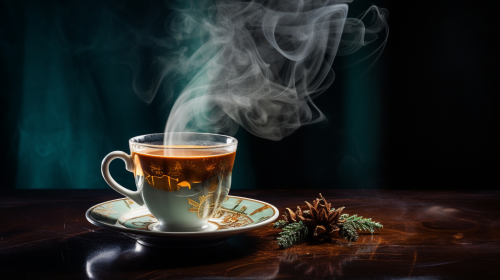 a cup of coffee, christmas tree, no smoking, style raw, --ar 16:9