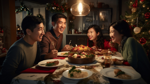 There is a happy strong Husky playing. At a Mexican modern house. At a Wonderful Christmas celebration with a beautiful big Christmas tree and a lot of Christmas gifts. There is a happy modern Mexican Family is opening gifts. There is mom, dad, a girl and two guys. And a happy tabby cat playing jumping. Christmas vibes. Full shot photo. Full scene. Ultra wide photo. 16 mm lens. Magazine photo. Ads photo. Cinematic. Stock photo style. Photo direction. Art direction. --ar 16:9