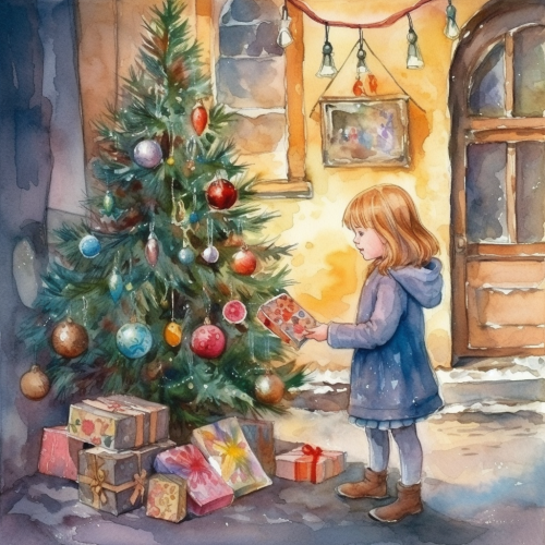 style of a children's illustrated book, minimal, bright Christmas colors, two field mice sipping tea in a Victorian coffee shop at Christmas, moonlight and tree lights through the window
