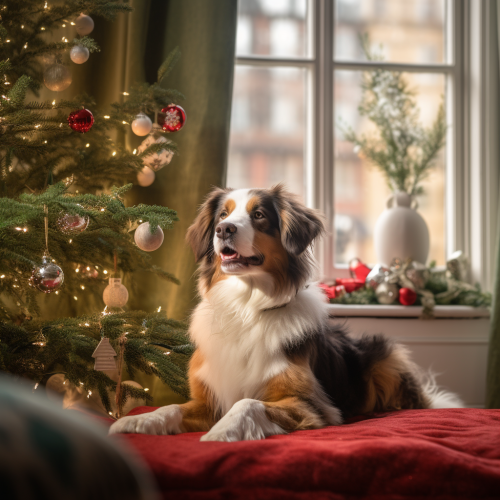 hyper-realistic photography nordmann fir christmas tree, full length zoomed out, festive, cosy living room, day time, normal setting, middle class, minimal decor, happy vibe, relaxed atmosphere, happy dog sitting in front of a christmas tree, london, Nikon D850, 85mm lens, f/ 1. 8, intense contrast, vivid colours, golden hour, perfect detail, realistic --ar 1:1