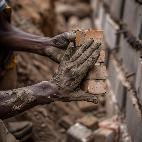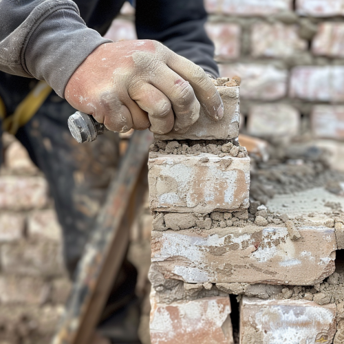 a close up of a brick being placed held with his hand onto a wall of bricks by a construction worker with his body centred. He is working on a construction site --v 6.0