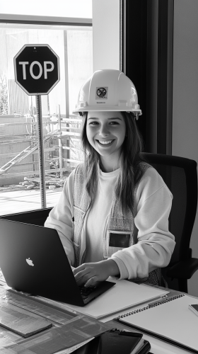 a young female construction worker sitting at an office at home smiling whilst on their laptop, there is a stop sign behind them, centre framed, black and white, storyboard style, --ar 9:16