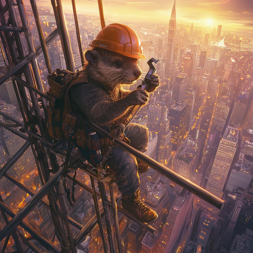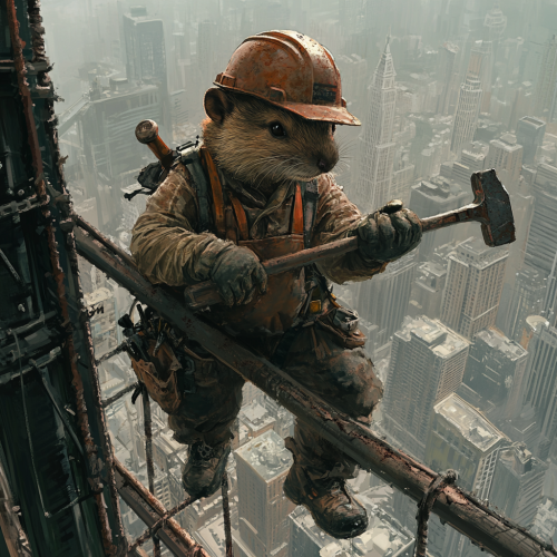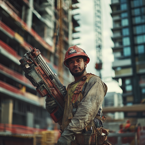 a Construction Worker holding an oversized nailgun over their sholder. they are standing in front of a half complted building that is in the middle of construction. cinematic wide angle film lense photo