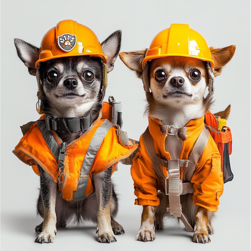 Cute little dogs wearing stylish in the style of Paw Patrol, dressed as miniature construction workers with safety gear and orange jackets, standing side by side on a white background, high-resolution photography, professional color grading, soft shadows, low contrast, clean, sharp focus digital photography.