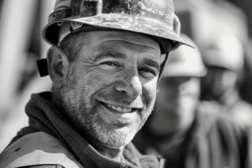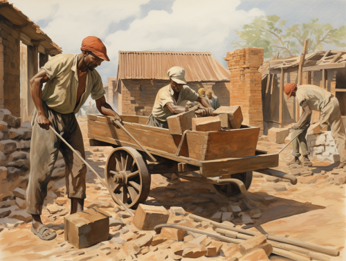 An auxiliary worker helps construction personnel in performing various tasks at a construction site, moving building materials, laying bricks, concreting, providing workers with tools and materials, unloading cargo, distributing materials to work stations and providing workers with everything they need. --ar 4:3