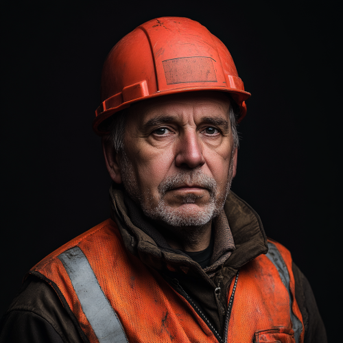 alfredo330 Nikon D850, Nikkor 70-200mm f/2.8E FL ED VR lens, Resolution 45.7 megapixels, ISO sensitivity: 64, 35 year old man, serious, dressed in construction worker's clothing, standing, looking at camera, black background --v 6.1
