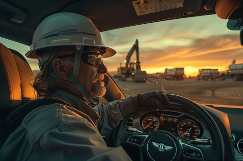 wide angle shot, a construction worker wearing a gray hardhat and safety glasses looking out the driver's side window of a Bentley Continental in a dirt parking lot full of pickup trucks at dawn --ar 3:2 --v 6.0