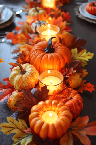 Ultra realistic photo of a harvest-themed table centerpiece featuring mini pumpkins, gourds, and artificial leaves arranged in the center. Candles nestled among these elements provide a soft, warm glow. The arrangement creates a cozy, seasonal focal point for dining and gatherings, capturing the essence of autumn, --v 6.1 --ar 2:3
