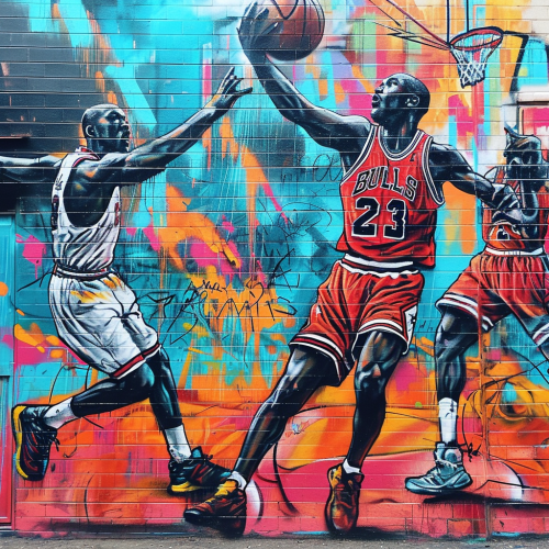 Urban 90s nostalgic mural of Michael Jordan with Chicago bulls taking a shot at the basket, multi color, graffiti --v 6.0