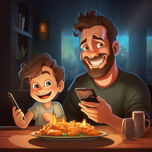 a father watches star wars on his phone sitting at the dinner table while his 6 year old daughter watches youtube on a big screen tv . Cartoon style.