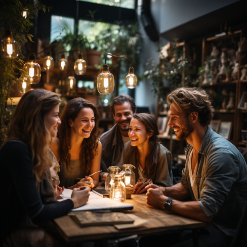 Photo of a group of various people who are discussing together happily. They are dressed with casual clothes. The room is similar to a bright class room. Hyper realistic photo --s 750