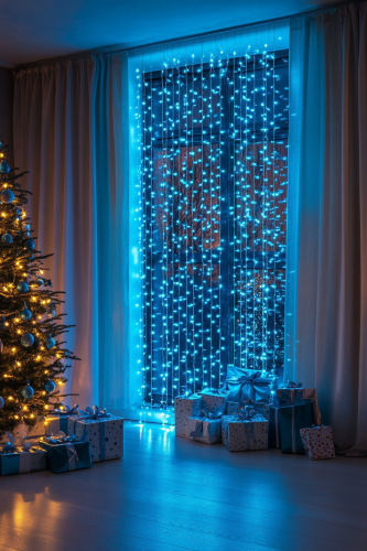 A garland of 300 LED bulbs made in cool blue color, in the living room, with gifts and a Christmas tree next to it. The background is curtains on the windows. Bright cold lighting in the room creates a cold atmosphere on New Year's Eve. The wide composition allows you to see the whole scene. Use high-quality SLR cameras to take pictures, highlighting details using photography.