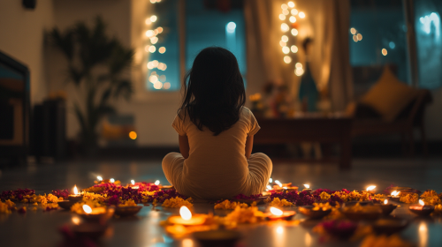 A ultra-realistic photograph of Indian young sibling in a huge living room decorated for diwali. The image was captured using a Canon EOS R5 with 50mm. --ar 16:9