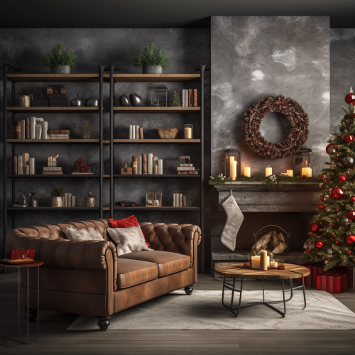 create a realistic backdrop of a living room decorated in christmas decor. Image should focus on a shelf hanging on wall.