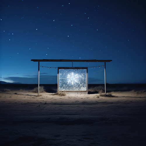 A backdrop of a clear desert night sky. Stars twinkle brightly, but more captivating are the intermittent and mysterious Marfa Lights, dancing on the horizon. The gentle ticking of a distant clock can be heard. There's an old-world charm, even though the setting seems futuristic.