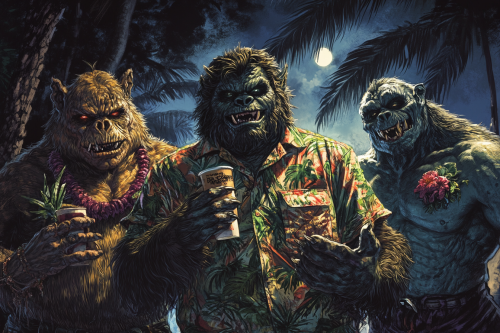 going to a party with dracula and swamp thing, bigfoot is there in a hawaiin shirt and he brought the swamp sisters and their cousin big bomba, looks like bride of frankenstein showed up with wolfman again but frankenstein's monster is being cool about it --ar 3:2