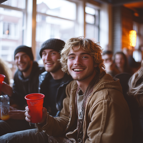 A candid photograph of friends at an urban house party in Amsterdam, drinking from red plastic cups and laughing on the couch. The men have blonde hair. There is wood cladding and white panel walls, with large windows and wooden beams. The photograph was shot on Kodak Gold 400 film. --style raw --s 750