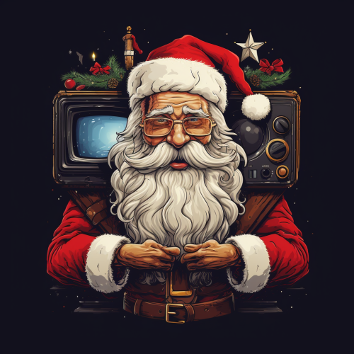 A character that looks like Santa Claus, illustrated in the exact style of Matt Groening, with flat colors and bold black outlines, closely resembling Fry from Futurama. The character is half Santa, half robot, with mechanical parts integrated into his body. He is holding an alien dog with tentacles, reminiscent of Zoidberg from Futurama, but still distinct and unique. The scene has a vibrant, cartoonish feel, maintaining the humorous and quirky aesthetic of Groening's animated shows.