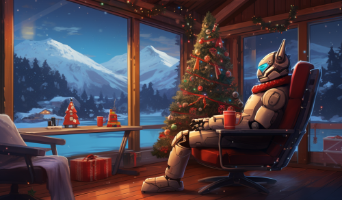 colorful festive holiday party inside a high-tech, cozy cabin. a robot is sitting in a chair staring out the window looking at a lightning bolt in the sky --ar 31:18