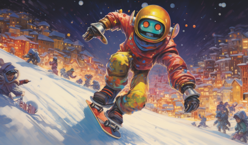 in a lively, colorful festive holiday scene, a robot in it's regular robot shell is snowboarding and a happy virbant human snowboarding with full space around them. --ar 31:18