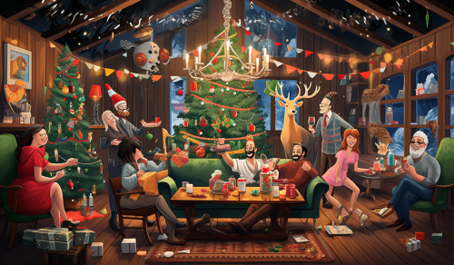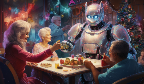 colorful festive holiday party at a high-tech, cozy cabin with 30 year old humans and AI articulate robots talking to each other --ar 31:18