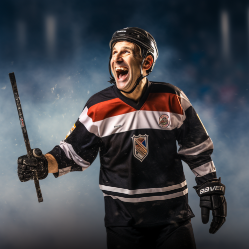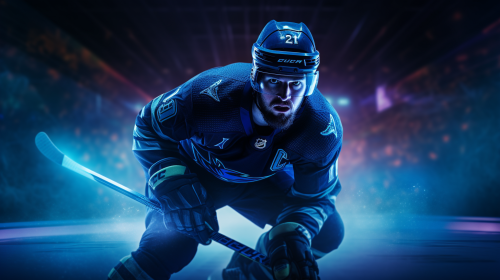 ce hockey player, environment is dark, blue glowing neon lights, nhl 24 style, game style, realistic image, insane details, Ultra-HD, --ar 16:9