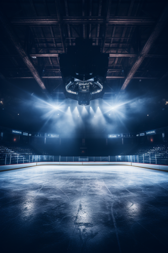 an empty hockey rink from ground level with epic arena lighting --ar 2:3 --s 150