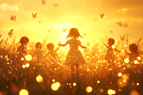3d CGI animated image of A glowing field of children shimmering with light, their bodies filled with love, joy, and wonder, under a golden sky, very detailed, bright colors, childrens book image, cinematic lighting, --ar 3:2