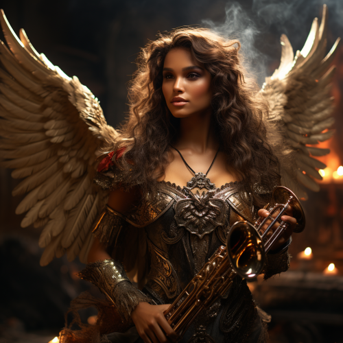 fierce woman warrior angel with beautiful wings, she is holding a trumpet, cinematic lighting --s 250
