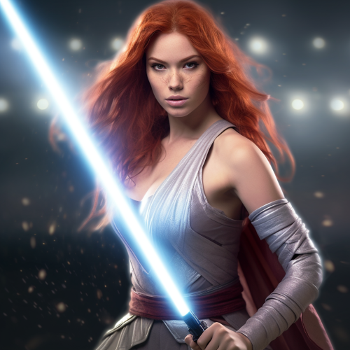 A beautiful, long-haired female warrior with vibrant red hair and blue eyes, dressed in a red strappy outfit, stands with her hair flowing in the wind. She holds a sword emitting an orange-red glow, fiercely facing off against multiple mechanical enemies. The warrior gazes forward in a battle stance, with flickering flames on the sword, adding dynamic energy and emphasizing the blade's power. The background is a 3d game style spaceship or corridor, scattered with various menacing robots, enhancing the tense, video-game-like atmosphere of this intense battle scene.