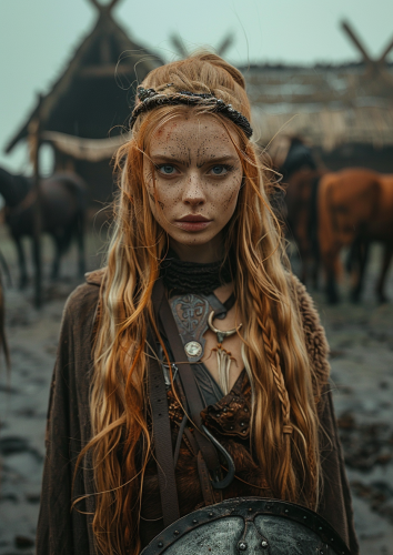 full-body-shot of fox head female shieldmaiden, longhouse in background, horses standing outside, viking helmet on ground, character shot, blurry background --ar 5:7 --stylize 750 --v 6.0