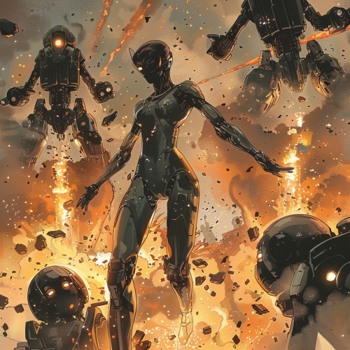 Focus closely on a dramatic scene where 5 to 6 humanoid droids, each of the same stature as the female cyborg warrior, are captured in the midst of simultaneous explosions. This detailed snapshot situates the warrior in the foreground, providing a clear contrast between her victorious stance and the chaos unfolding behind her. Each droid is depicted in a distinct pose of destruction, with arms and legs flailing, as they are engulfed in bright, fiery blasts. The explosions should be rendered with intense detail, showcasing a range of colors from bright yellows and oranges to deep reds, illustrating the heat and energy of the blasts. Debris from the droids, including metal parts and electronic components, is shown flying through the air, creating a dynamic sense of motion and impact. The background, while secondary to the action, subtly hints at the urban battlefield setting, with ruined structures and smoky skies adding to the atmosphere of devastation. The female cyborg warrior, though part of the scene, remains calm and composed, her figure outlined against the backdrop of destruction. Her expression is one of determination and resolve, emphasizing her role as the catalyst of the droids' demise. The scene is imbued with the essence of 1990s anime, utilizing exaggerated motion lines and dramatic shading to highlight the action and energy of the moment. This composition is meticulously crafted to draw the viewer's attention to the droids' explosive end, balancing the intensity of the moment with the warrior's stoic presence. The detailed depiction of the droids' destruction, matched in scale and detail to the warrior, serves to underscore the magnitude of her power and the decisive outcome of the battle.