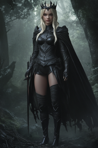 a full body shot of a beautiful female human shadow princess. She wears tight leather armor over her pale skin, a black cape, a black tiara, and has daggers strapped to her thigh. Black shadowy mist curves around her feet. In the background is a shadowy forest with subtle moon beams. Fantasy art detailed digital painting --ar 2:3 --v 6.1