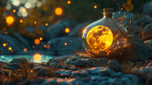 miniture landscape,photorealisitc Glowing moon in a bottle with mystical fairy lights,Crystal Cave,8k,ultra detaile --ar 16:9 --v 6.0