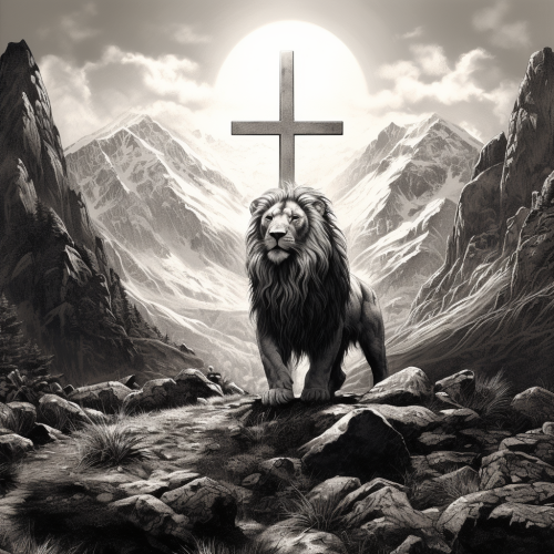 Create a black and white image of a lion walking through massive beautiful mountains looking at a massive large cross on a distant mountain