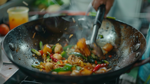 pov shot of guava being stir fried in a wok as a meal in the philippine home. there are other ingredients that makes the food look vibrant and appetising. --v 6.0 --style raw --ar 16:9
