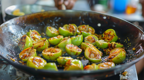 pov shot of guava being fried in a wok in the philippine home. food looks vibrant and appetising. --v 6.0 --style raw --ar 16:9